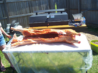 Our plan was to arrive the night before the first day of the event, set up, and start smoking that night to be ready for the first customers by 10 a.m.; unfortunately mother nature had other plans for us and the rest of the participants of the event. We loaded the truck, hooked up the smoker, and just as we were getting ready to lockup the house and head to the event...it started to storm. Now folks, anyone out there living in Ohio knows that the weather here can turn on a dime...and it does. When I first moved to Ohio I was told if I didn't like the weather to just wait about 15 minutes because it would change. They were right! We quickly turned on the television and sure enough there were storm warnings with a high wind advisory/tornado watch in place for the rest of the night...great! So, knowing we would be a day behind we decided to stay home, get a good nights sleep, and just start fresh in the morning. Sometimes these little reminders are necessary to help us realize exactly who is in charge of the planning.
